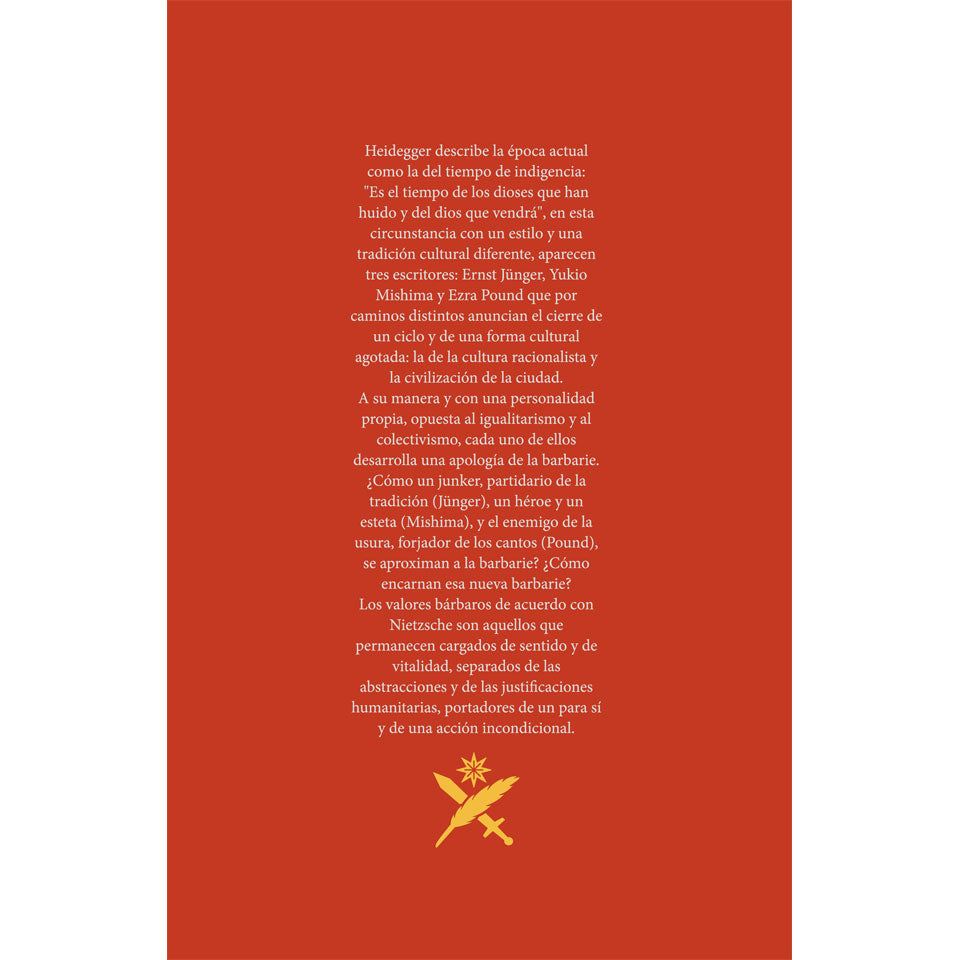 ¿Cómo un junker, partidario de la tradición (Jünger), un héroe y un esteta (Mishima), y el enemigo de la usura, forjador de Los Cantos (Pound), se aproximan a la barbarie? ¿Cómo encarnan esa nueva barbarie?