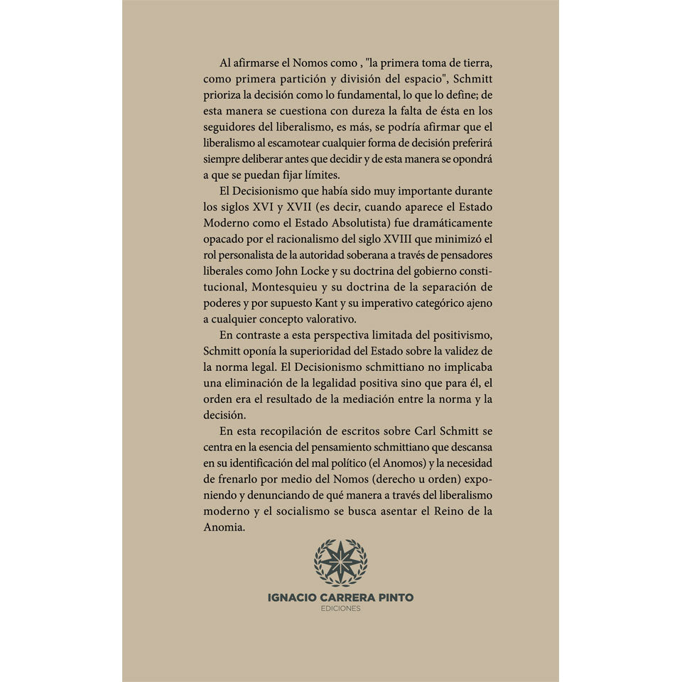 El gran libro y de innegable vigencia nos presenta una recopilación de escritos sobre Carl Schmitt representando la esencia del pensamiento Schmittiano que descansa en su identificación del mal político (el Anomos) y la necesidad de frenarlo por medio del Nomos (derecho u orden) exponiendo y denunciando de qué manera a través del liberalismo moderno y el socialismo se busca asentar el Reino de la Anomia.