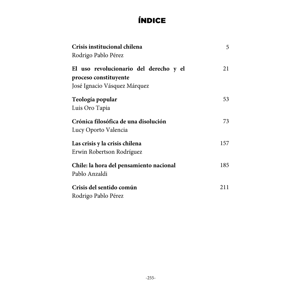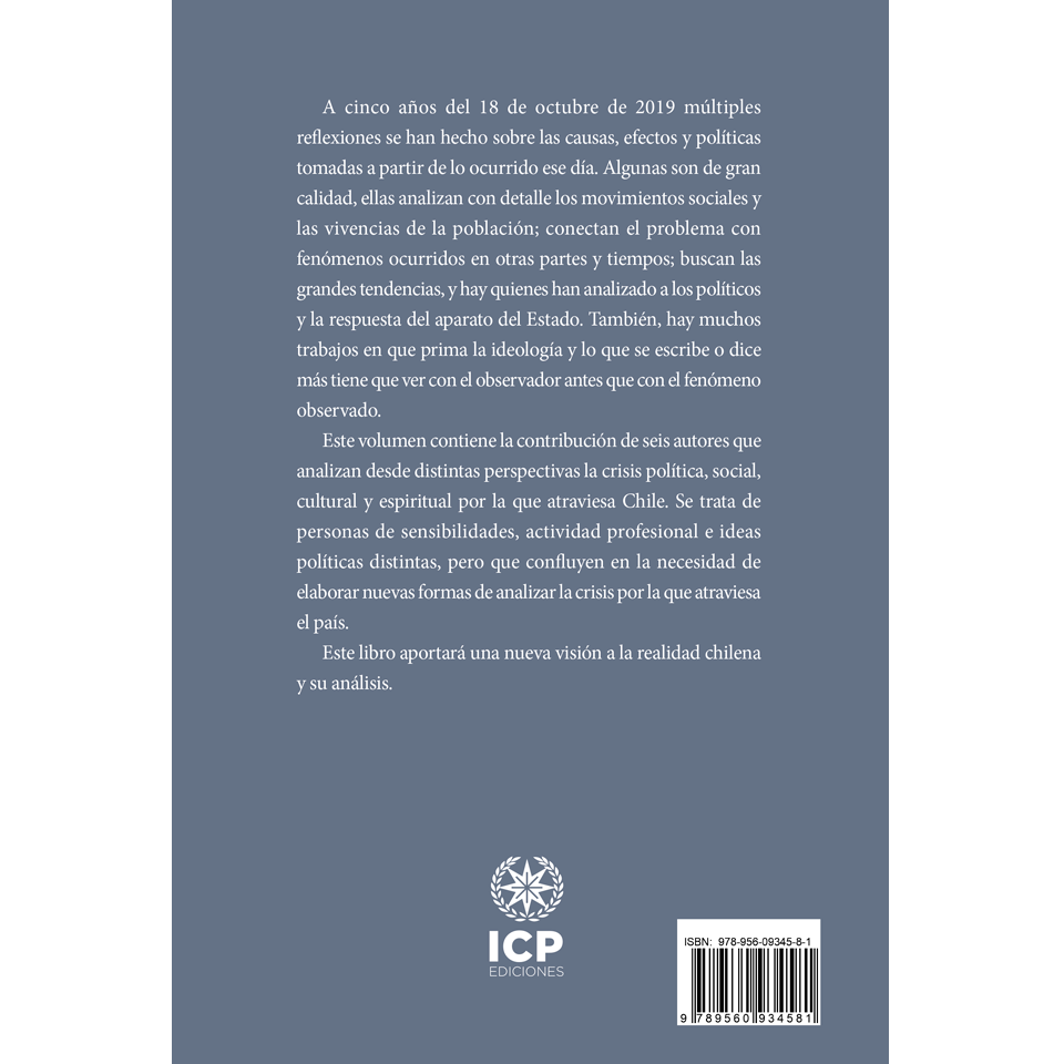 Este volumen contiene la contribución de seis autores que analizan desde distintas perspectivas la crisis política, social, cultural y espiritual por la que atraviesa Chile. Se trata de personas de sensibilidades, actividad profesional e ideas políticas distintas, pero que confluyen en la necesidad de elaborar nuevas formas de analizar la crisis por la que atraviesa el país.