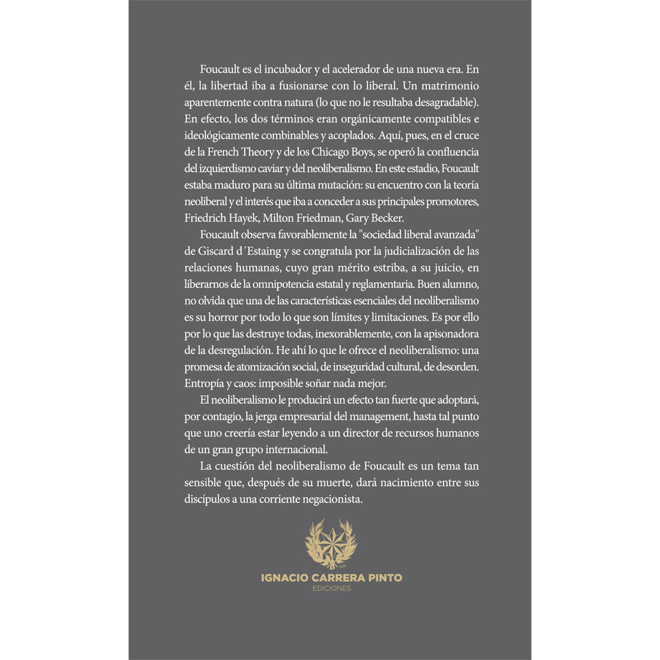 Foucault es el incubador y el acelerador de una nueva era. En él la libertad iba a fusionarse con lo liberal. Un matrimonio aparentemente contra natura (lo que no le resultaba desagradable). En el cruce de la French Theory y de los Chicago Boys, se operó la confluencia del izquierdismo caviar y del neoliberalismo, en su última mutación se produce el encuentro con la teoría neoliberal y el interés que iba a conceder a sus principales promotores, Hayek, Friedman y Becker.