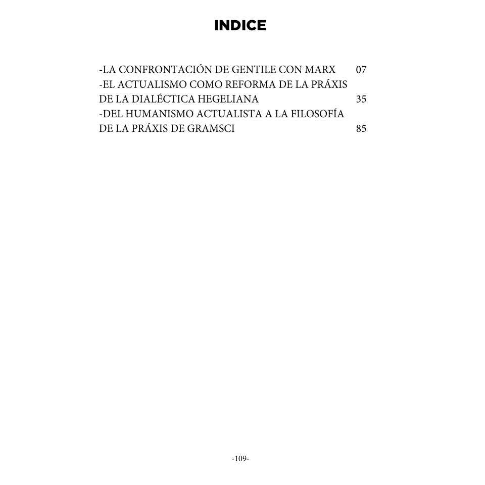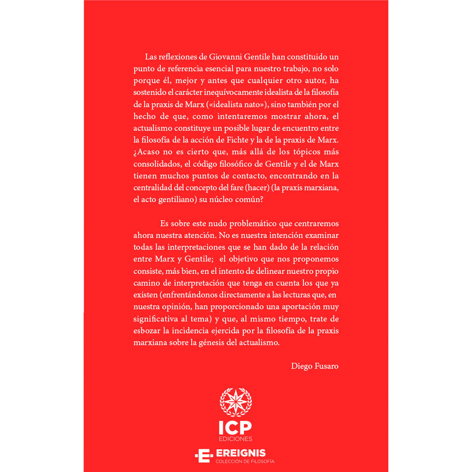 Las reflexiones de Giovanni Gentile han constituido un punto de referencia esencial para nuestro trabajo, no solo porque él, mejor y antes que cualquier otro autor, ha sostenido el carácter inequívocamente idealista de la filosofía de la praxis de Marx («idealista nato»), sino también por el hecho de que, como intentaremos mostrar ahora, el actualismo constituye un posible lugar de encuentro entre la filosofía de la acción de Fichte y la de la praxis de Marx. ¿Acaso no es cierto que, más allá de los tópicos más consolidados, el código filosófico de Gentile y el de Marx tienen muchos puntos de contacto, encontrando en la centralidad del concepto del fare (hacer) (la praxis marxiana, el acto gentiliano) su núcleo común?