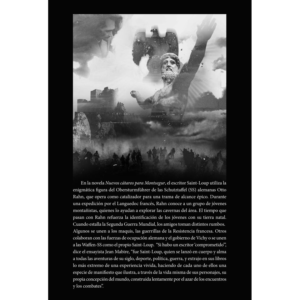 En la novela Nuevos cátaros para Montsegur, el escritor Saint-Loup utiliza la enigmática figura del Obersturmführer de las Schutztaffel (SS) alemanas Otto Rahn, que opera como catalizador para una trama de alcance épico. Durante una expedición por el Languedoc francés, Rahn conoce a un grupo de jóvenes montañistas, quienes lo ayudan a explorar las cavernas del área. El tiempo que pasan con Rahn refuerza la identificación de los jóvenes con su tierra natal. Cuando estalla la Segunda Guerra Mundial, los amigos toman distintos rumbos. Algunos se unen a los maquis, las guerrillas de la Resistencia francesa. Otros colaboran con las fuerzas de ocupación alemana y el gobierno de Vichy o se unen a las Waffen-SS como el propio Saint-Loup. “Si hubo un escritor ‘comprometido’”, dice el ensayista Jean Mabire, “fue Saint-Loup, quien se lanzó en cuerpo y alma a todas las aventuras de su siglo, deporte, política, guerra, y extrajo en sus libros lo más extremo de una experiencia vivida, haciendo de cada uno de ellos una especie de manifiesto que ilustra, a través de la vida misma de sus personajes, su propia concepción del mundo, construida lentamente por el azar de los encuentros y los combates”.