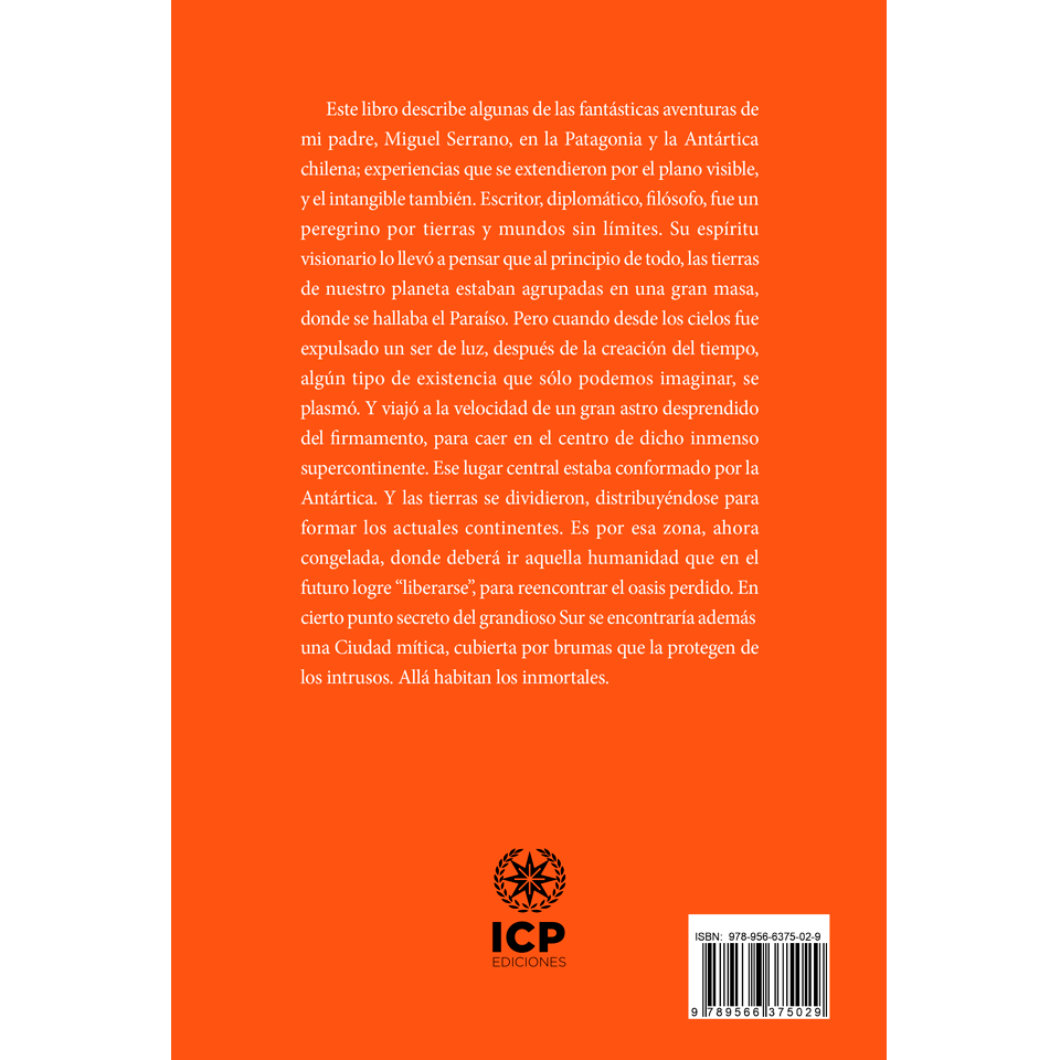 Este libro describe algunas de las fantásticas aventuras de mi padre, Miguel Serrano, en la Patagonia y la Antártica chilena; experiencias que se extendieron por el plano visible, y el intangible también. Escritor, diplomático, filósofo, fue un peregrino por tierras y mundos sin límites. Su espíritu visionario lo llevó a pensar que al principio de todo, las tierras de nuestro planeta estaban agrupadas en una gran masa, donde se hallaba el Paraíso. Pero cuando desde los cielos fue expulsado un ser de luz, después de la creación del tiempo, algún tipo de existencia que sólo podemos imaginar, se plasmó. Y viajó a la velocidad de un gran astro desprendido del firmamento, para caer en el centro de dicho inmenso supercontinente. Ese lugar central estaba conformado por la Antártica. Y las tierras se dividieron, distribuyéndose para formar los actuales continentes. Es por esa zona, ahora congelada, donde deberá ir aquella humanidad que en el futuro logre “liberarse”, para reencontrar el oasis perdido. En cierto punto secreto del grandioso Sur se encontraría además una Ciudad mítica, cubierta por brumas que la protegen de los intrusos. Allá habitan los inmortales.